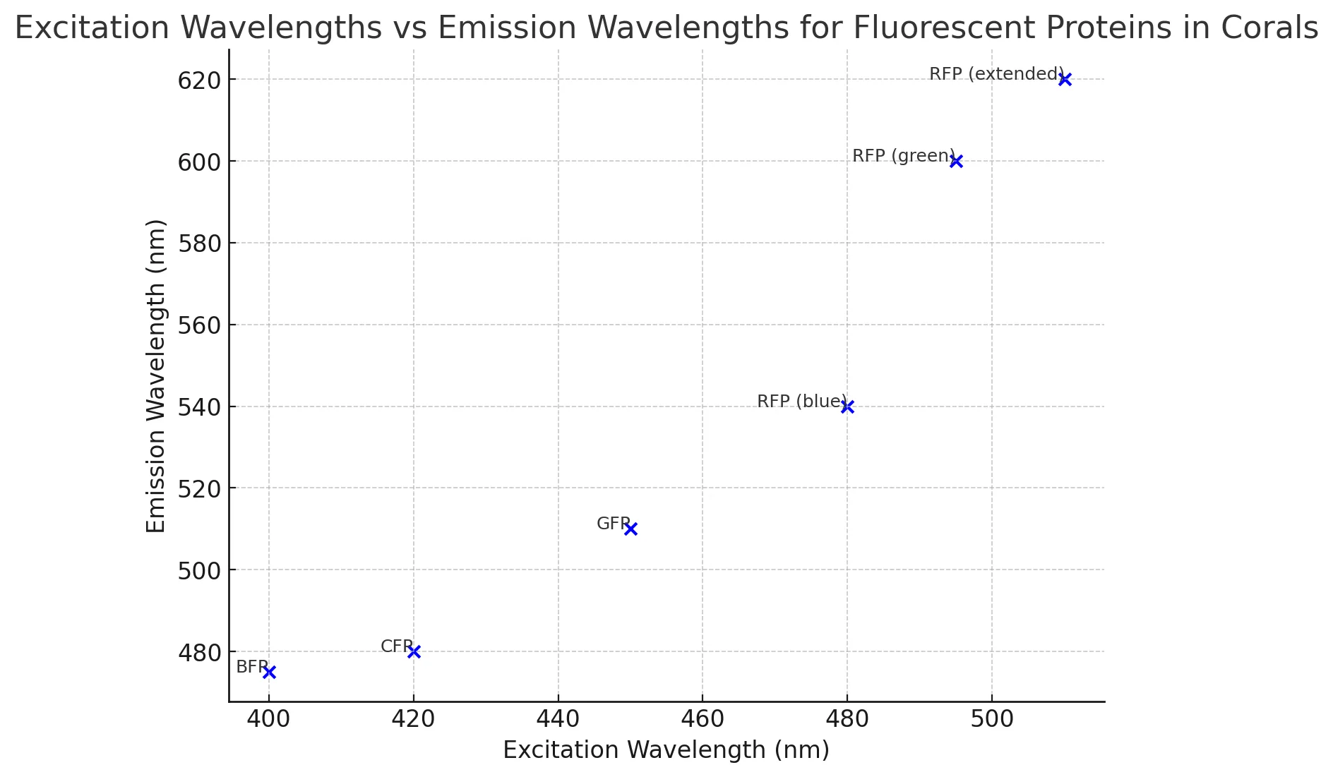 Here is a chart that illustrates the relationship between the excitation wavelengths and the emission wavelengths for fluorescent proteins in corals. As you can see, each fluorescent protein responds to specific wavelengths of light for excitation, and they emit light at longer wavelengths, producing the vibrant fluorescence we observe in corals.