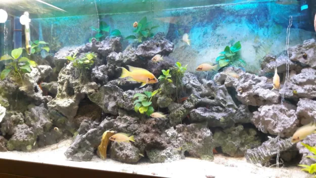 Tanganica aquarium ( 100x50x60) . Fishes: a colony of Neolamprologus helianthus