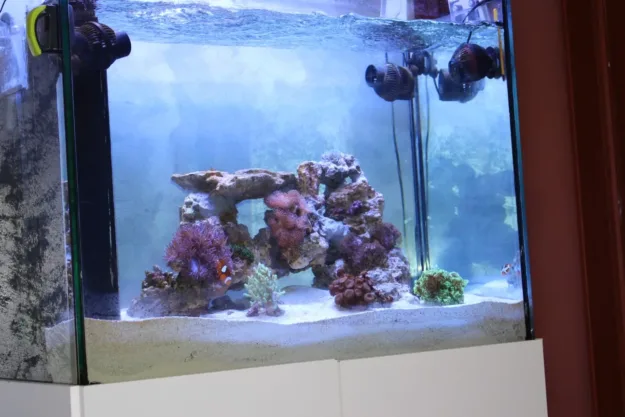 Vasca 40x40x40 con scarico blau sump 60x30x30 skimmer bubble magus c5 risalita jebao dc 3000 pompe di movimento jebao rw4 controllo temperatura con stc1000 impostato a 24 gradi plafoniera gnc am366 piu 2 barre easy led deep metodo berlinese 13 kg di roccia viva prevalenza sps 3 ocellaris 4 turbo 1 riccio mespilia