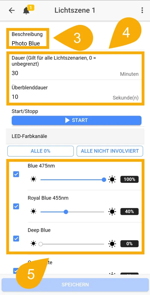Wenn Sie diese Lichtszene testen möchten, tippen Sie auf den Button START.