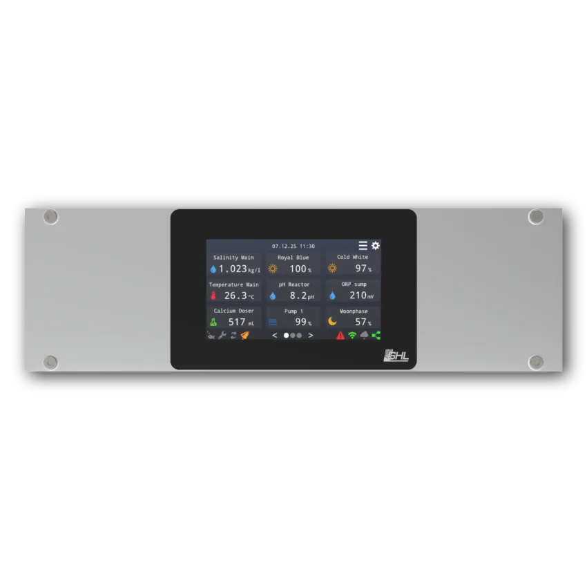 Das GHL Control Pad IL (Industrial Line) ist ein kompaktes, dauerhaft aktives Touch-Display und als feste Erweiterung des ProfiLux IL konzipiert. Es bietet eine klare Übersicht über zentrale Systemwerte sowie schnellen Zugriff auf manuelle Steuerungen und Systemaktionen – ganz ohne Smartphone oder App.