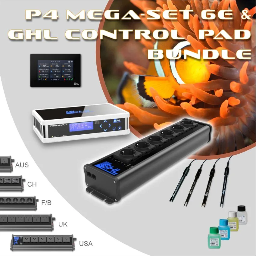 The ProfiLux 4 Mega-Set 6E + GHL Control Pad Bundle provides a complete solution for advanced aquarium monitoring and control. It includes the fully equipped ProfiLux 4 controller with accessories, together with the GHL Control Pad – a compact, always-on touchscreen display that offers quick access to key measurements, system states, and manual control functions.
