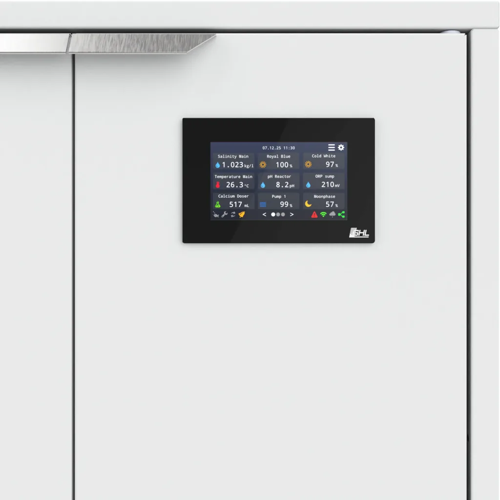 Das GHL Control Pad ist ein kompaktes, dauerhaft eingeschaltetes Touchscreen-Display, das direkt mit Ihrem ProfiLux 4(e) verbunden wird. Es bietet eine klare, jederzeit sichtbare Übersicht über die wichtigsten Messwerte und Systemzustände Ihres Aquariums und ermöglicht schnellen Zugriff auf zentrale Funktionen – ganz ohne Smartphone und ohne App.
