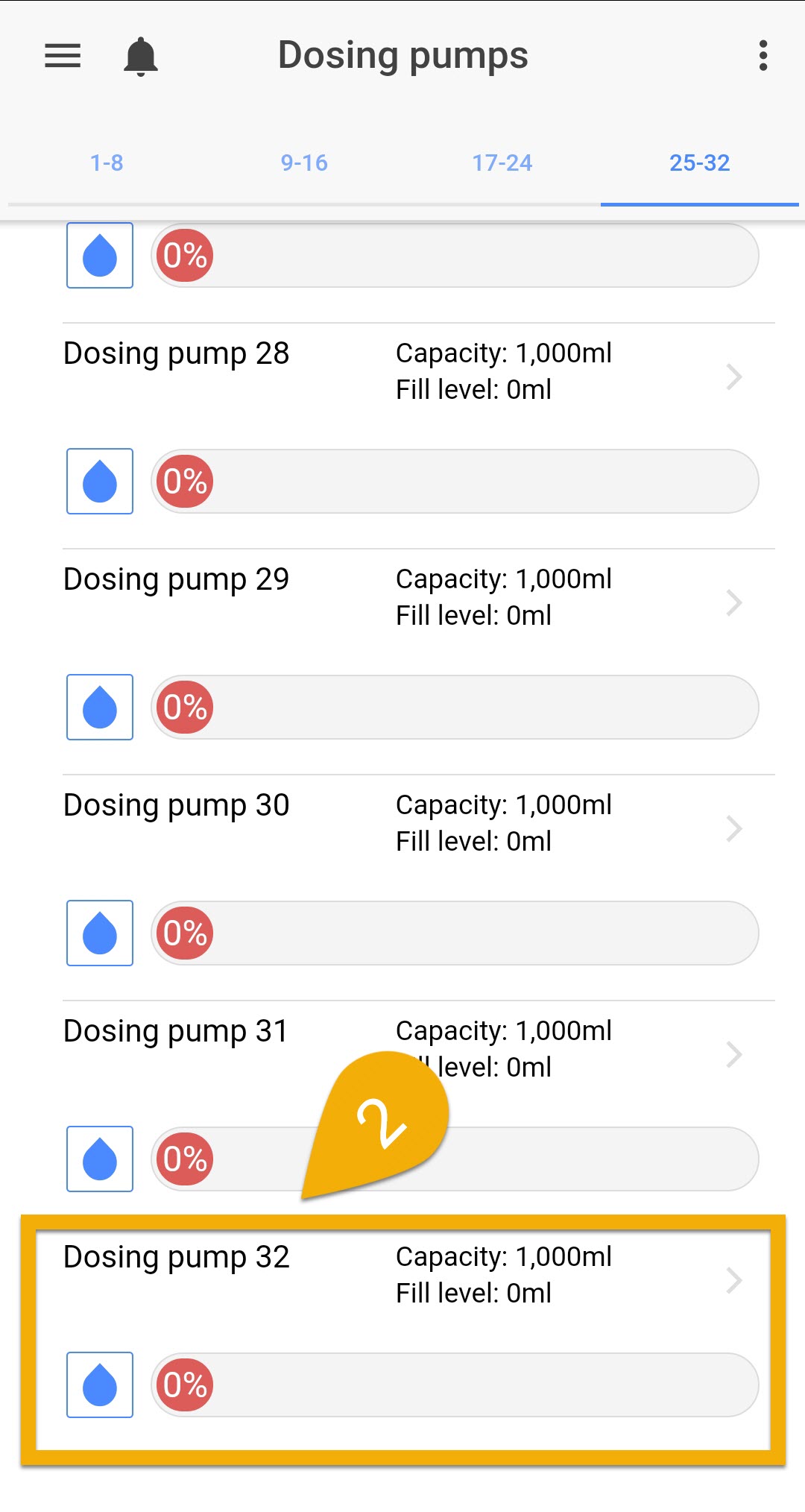 Select an unused dosing pump channel such as Dosing pump 32 as shown in the example below. This will be your virtual dosing pump which you will use to create your dosing schedule. Later on, we will show you how to tie-in your physical dosing pump so it reacts to this dosing schedule and pH value.