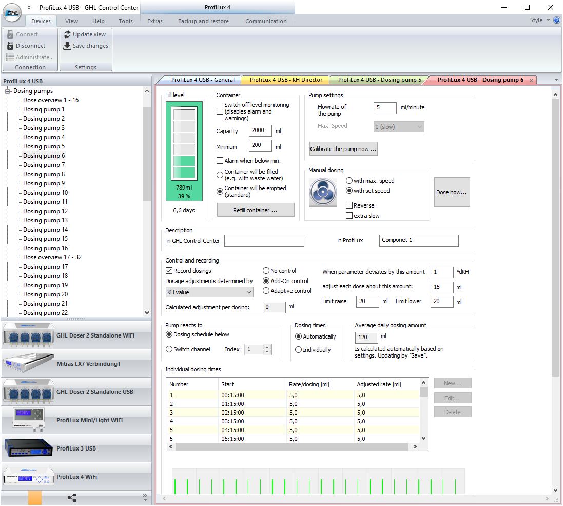 As of firmware 7.24 for the ProfILux 4 and firmware 1.37 for the Doser SA, the settings of the Adaptive Control and the Add-On Control are no longer in the KH Director settings, but in the settings of the corresponding dosing pump.