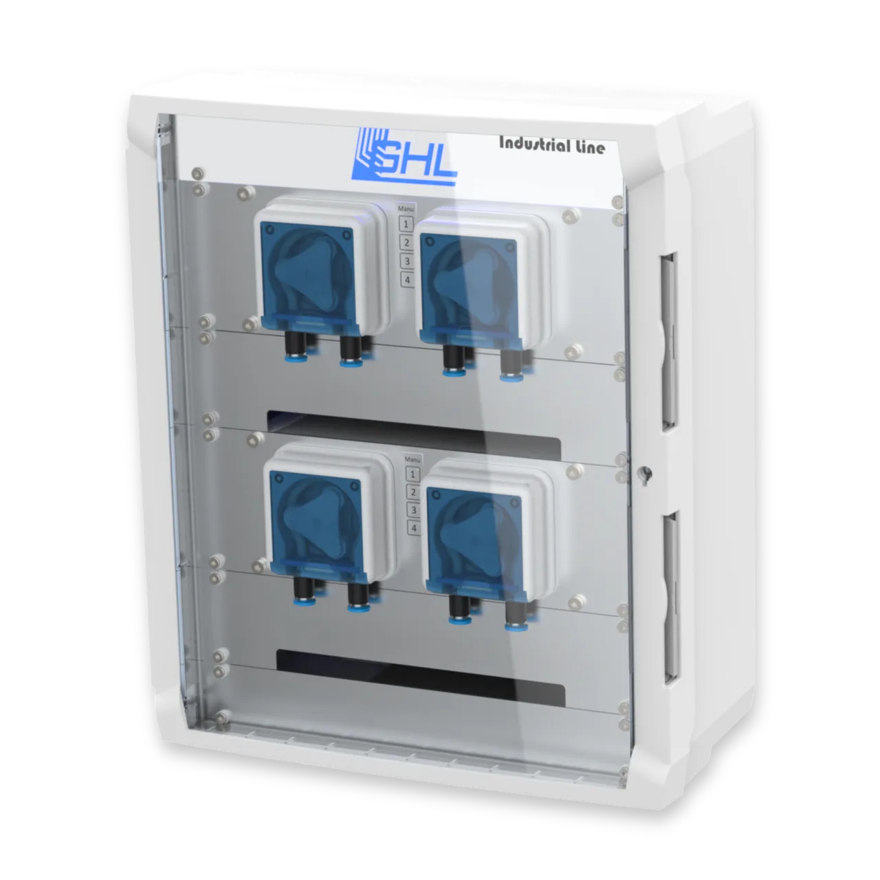 The system combines a Doser 3 Maxi SA IL and a Doser 3 Maxi EXT IL in a single IP54-rated Industrial Line enclosure, providing 4 independent high-volume peristaltic pump channels. Both units feature GHL’s SilentDrive technology — advanced motor driver circuits engineered for exceptionally quiet operation. Each pump delivers up to approximately 350 ml/min with 0.1 mL resolution and up to 250 micro doses per day.