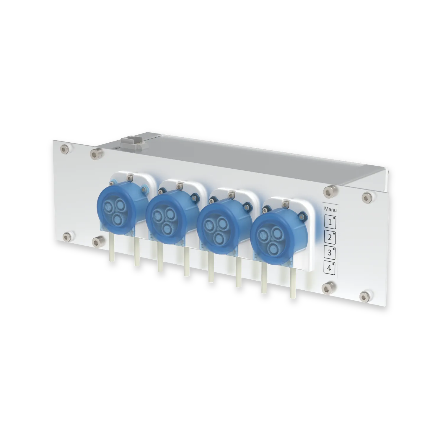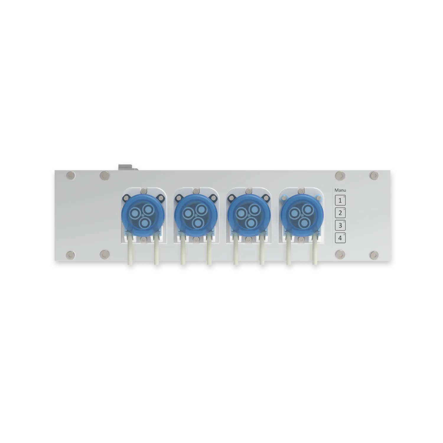 The four precision peristaltic pumps with 24V stepper motors deliver the same highly accurate dosing performance as the Stand Alone version – 0.1 mL resolution, up to 150 micro doses per day in automatic mode, or up to 8 individually programmable dosing times per pump.